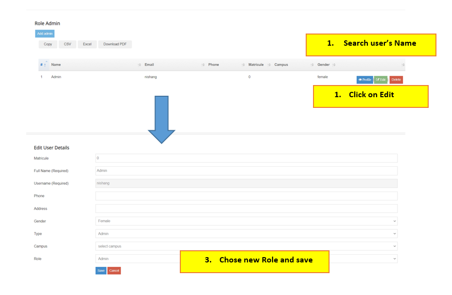 To change a user role, Click on User Account > Add admins > Search the name from the table and click on the Edit button across the name, Chose the new role and save. The user will need to logout and login again