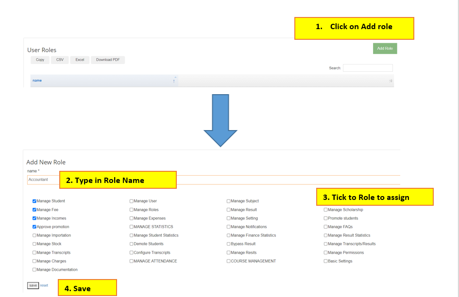 Click on User Account > Roles > Click on add Role at the Top right > Write the Role or Office Name > Tick all the permissions that role is allowed to view and Save