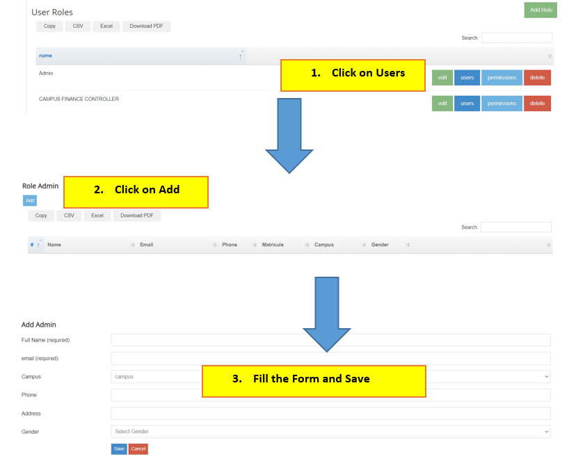 Click on User Account > Roles > Click on Users across that role > Click on add button at the top right > Fill in the form and mark sure you are using a valid email for the user and save
