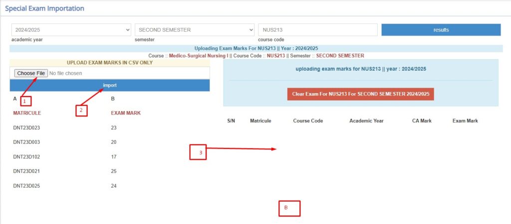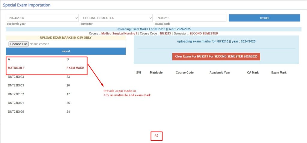 Here, just the exam marks of a given course are imported by typing the course code and the system displays just that given code and from there proceed to exam marks importation.