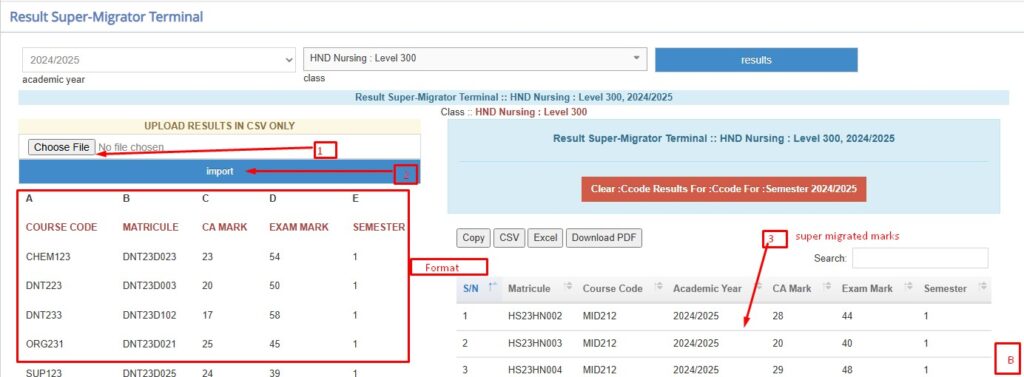 Permits bulk marks (CA and exams) importation into the system irrespective of the semester. Here a collection of students marks, and their semesters can be imported using the format. The excel file contains the following columns=>Course code, Matricule, CA marks, Exam marks and Semester